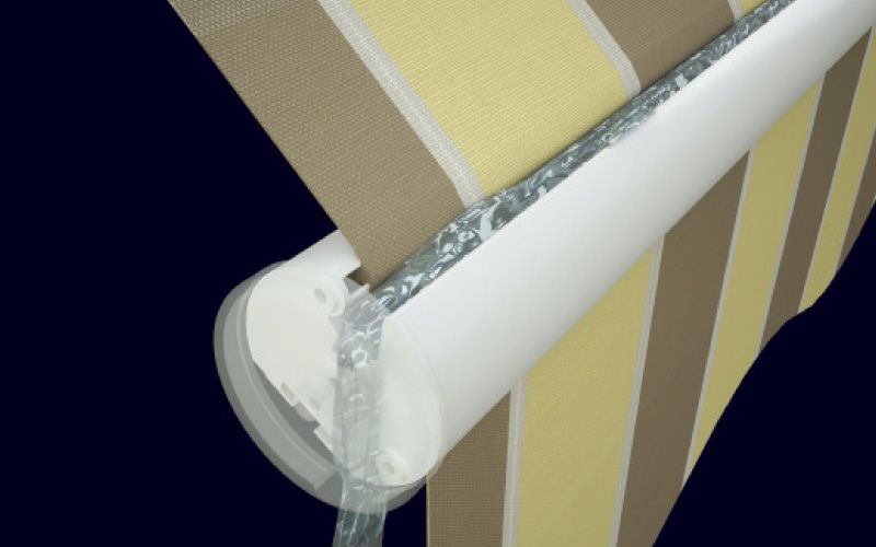 Il profilo con grondaia convoglia l’acqua sulle estremità e la fa defluire all’interno del doppio tappo di chiusura, regolabile in funzione della pendenza della tenda.